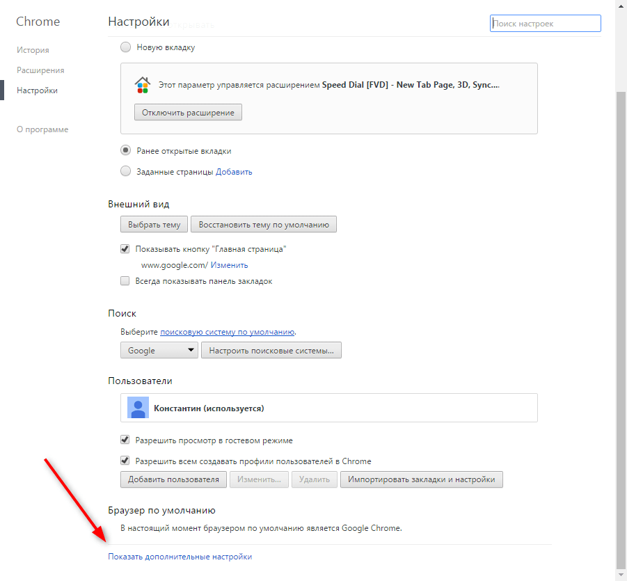 Скроллим страницу в самый низ, пока не встретимся с пунктом «Показать дополнительные настройки», открываем его;