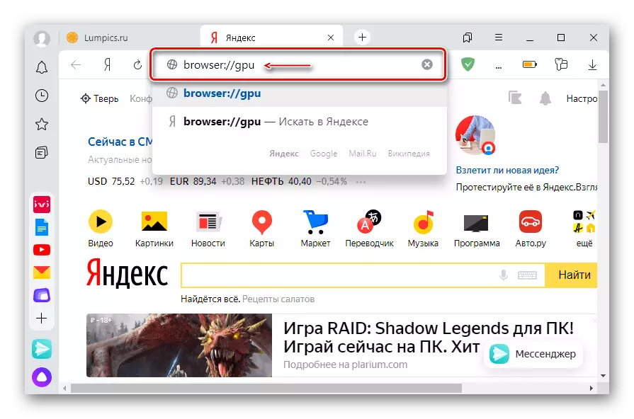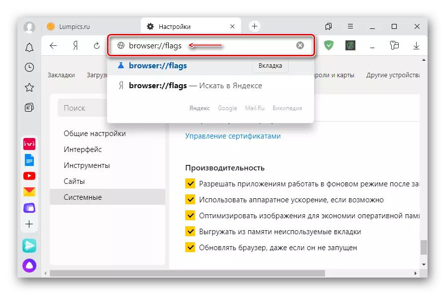 - We run Yandex.Browser, open the «Settings» and check whether the hardware acceleration is enabled. To do this, enter the command in the address bar: