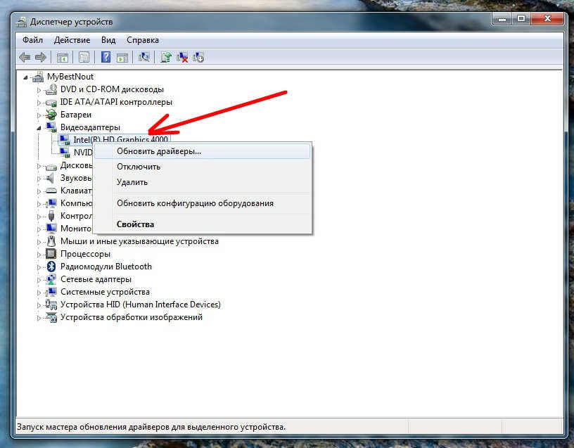 - Нажмите на проблемное оборудование правой кнопкой мыши и выберите пункт «Обновить драйвера».