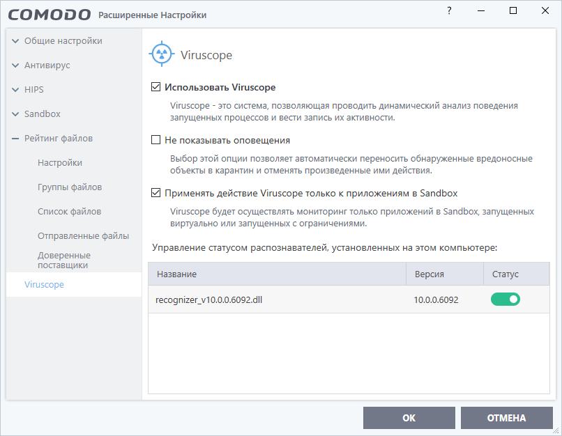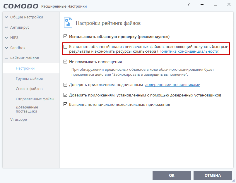 «, а так же «Анонимно оправлять в COMODO данные об использовании приложения для внесения изменений, улучшающих работу программы