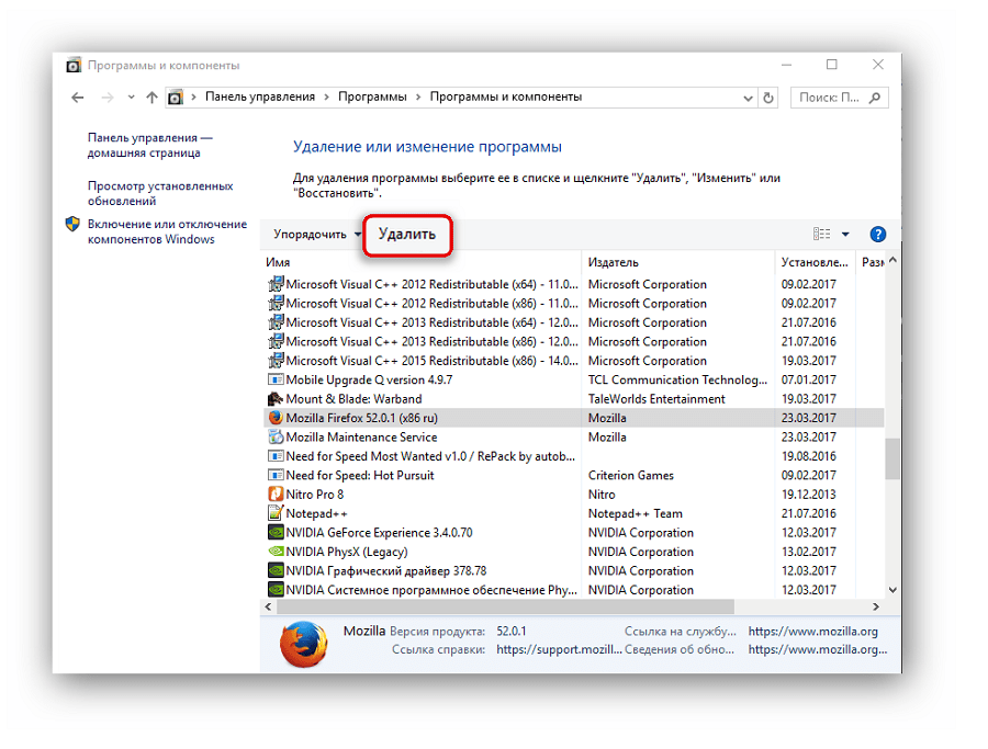 Находим Mozilla Firefox, нажимаем «Удалить».