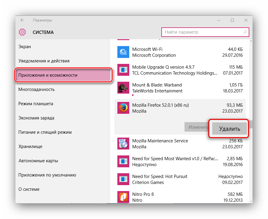 Выбираем пункт «Приложения и Возможности». В нем находим Mozilla Firefox и нажимаем «Удалить».