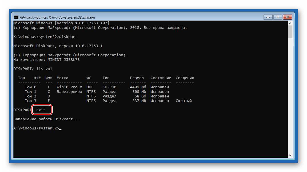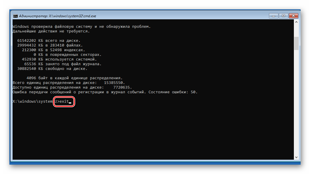 Здесь «d:» — литера системного носителя, а /f /r – аргументы, разрешающие утилите исправлять «битые» сектора и программные ошибки. После того как процесс будет завершен, выходим из консоли.