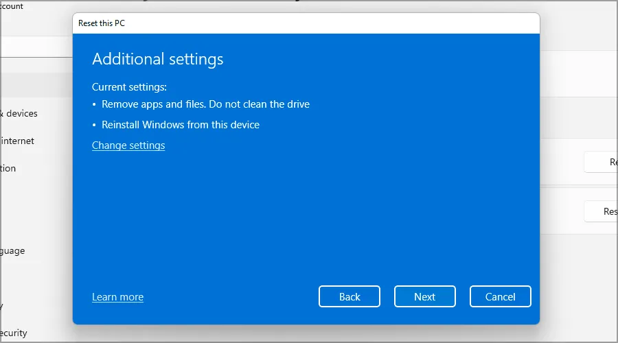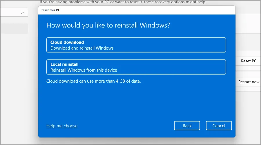Выберите нужный тип переустановки. Мы использовали локальную переустановку.