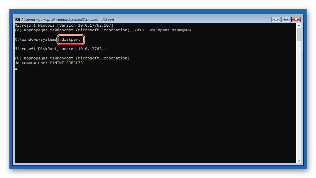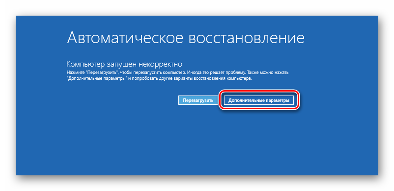 В ситуации, когда загрузка невозможна, следует воспользоваться средой восстановления, запустив в ней «Командную строку». Данное меню откроется после того, как исчезнет синий экран с информацией.