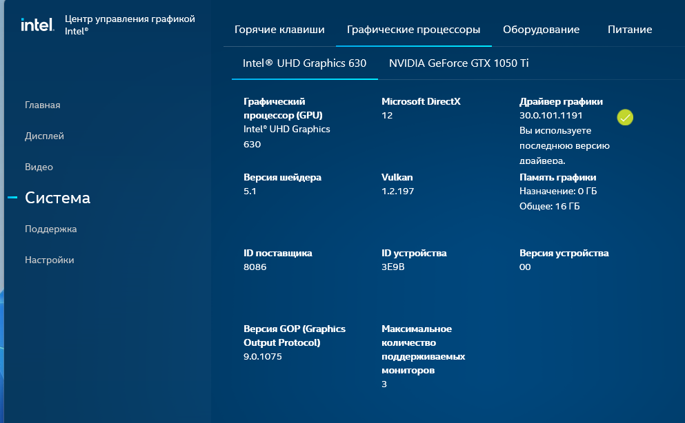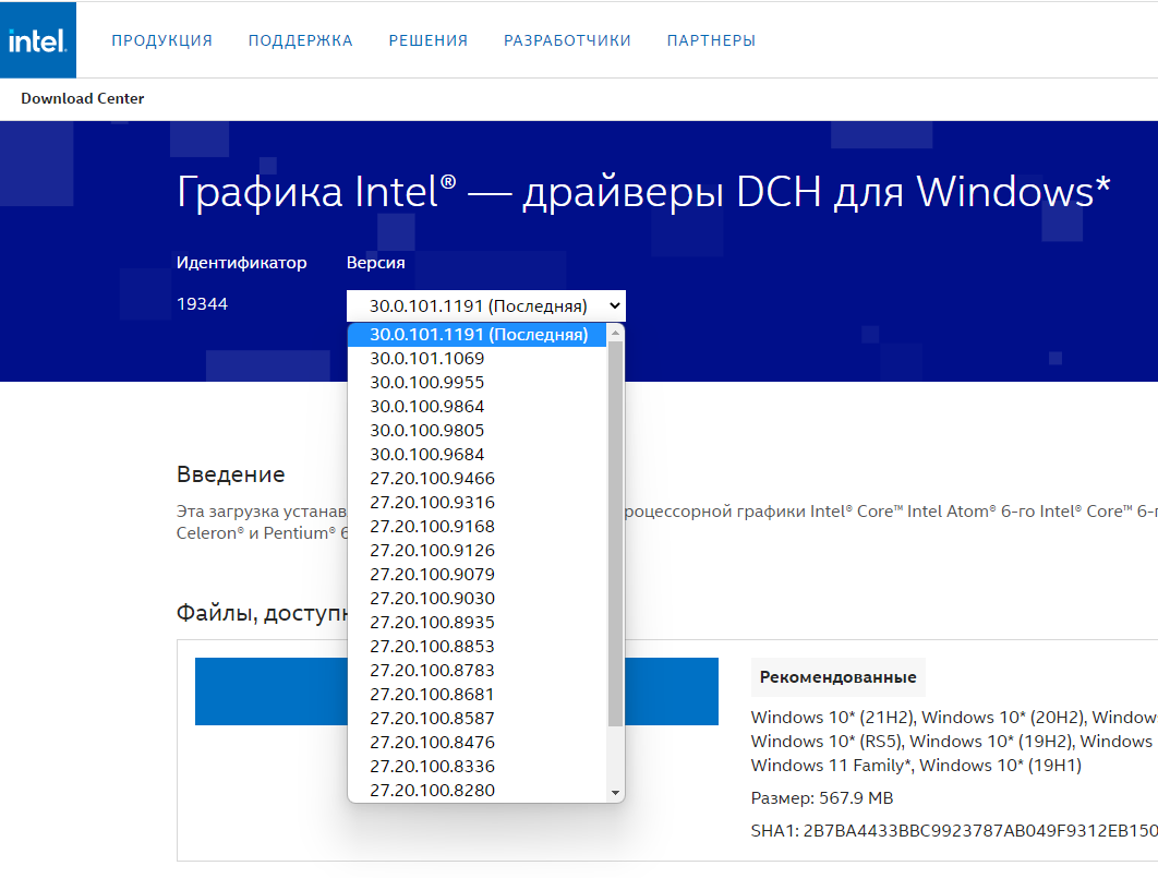 Но на странице «Графика Intel — драйверы DCH для Windows» (https://www.intel.ru/content/www/ru/ru/download/19344/intel-graphics-windows-dch-drivers.html) последней версией, на момент написания, является 30.0.101.1191. Данный драйвер поддерживает процессоры Intel от 6-го по 12-е поколения.
