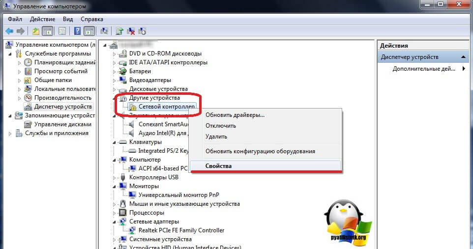 Откройте Диспетчер устройств. В Диспетчере устройств, найдите устройство, для которого отсутствует драйвер. Щелкните на нем правой кнопкой мыши и выберете пункт «Свойства»: