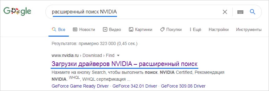 Наберите в поисковике «расширенный поиск NVIDIA» и перейдите на указанную страницу.