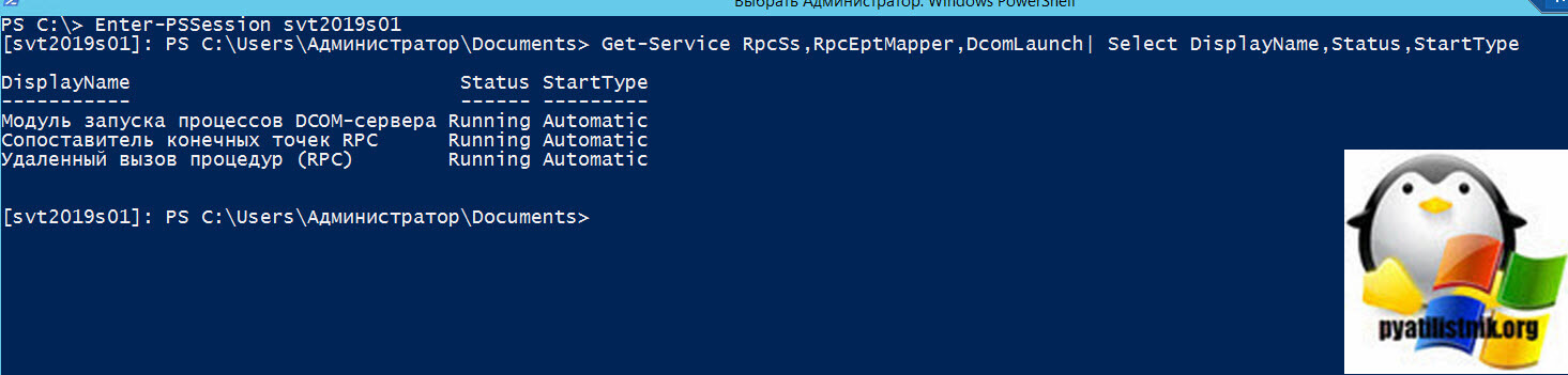 Для удаленного выполнения Enter-PSSession svt2019s01 далее Get-Service RpcSs,RpcEptMapper,DcomLaunch| Select DisplayName,Status,StartType