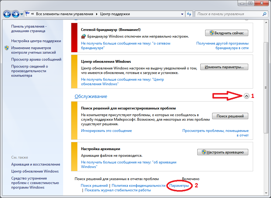Первым делом нажмите на стрелочку (см. скриншот) в разделе Обслуживание. Это откроет ранее скрытые пункты, и вы сможете добраться до параметров. Выберите там пункт «Не проверять на наличие новых решений».