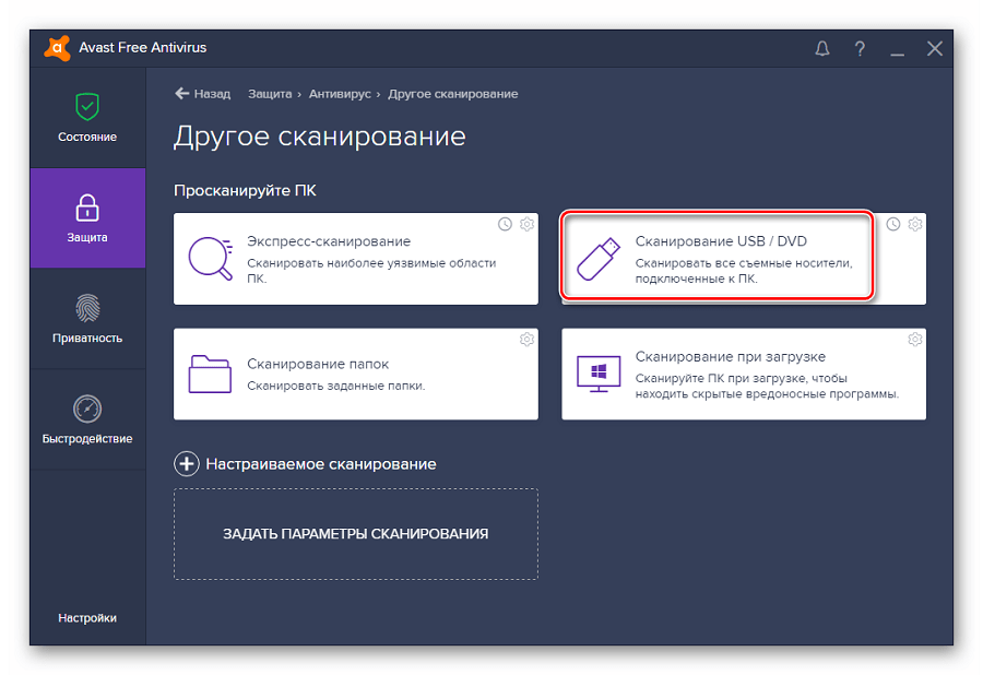 Сегодня этот антивирус считается одним из самых популярных в мире, и для наших целей он прекрасно подходит. Чтобы воспользоваться Avast! Free Antivirus для очистки USB-накопителя, сделайте следующее: