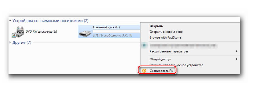 Также можно просканировать носитель через контекстное меню. Для этого выполните ряд простых шагов: Кликните по флешке правой кнопкой и выберете «Сканировать».