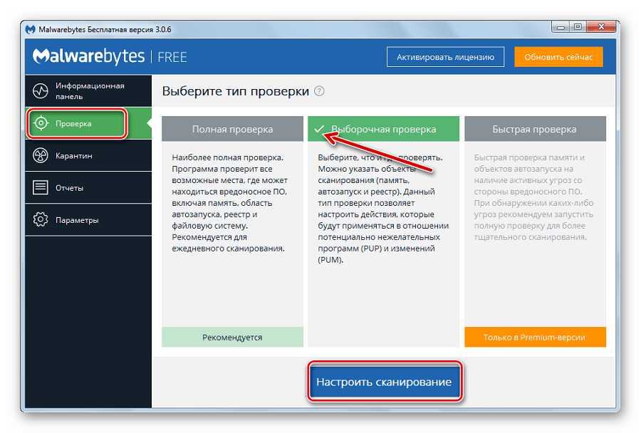 - Запустите программу и выберете вкладку «Проверка». Здесь отметьте «Выборочная проверка» и нажмите кнопку «Настроить сканирование».