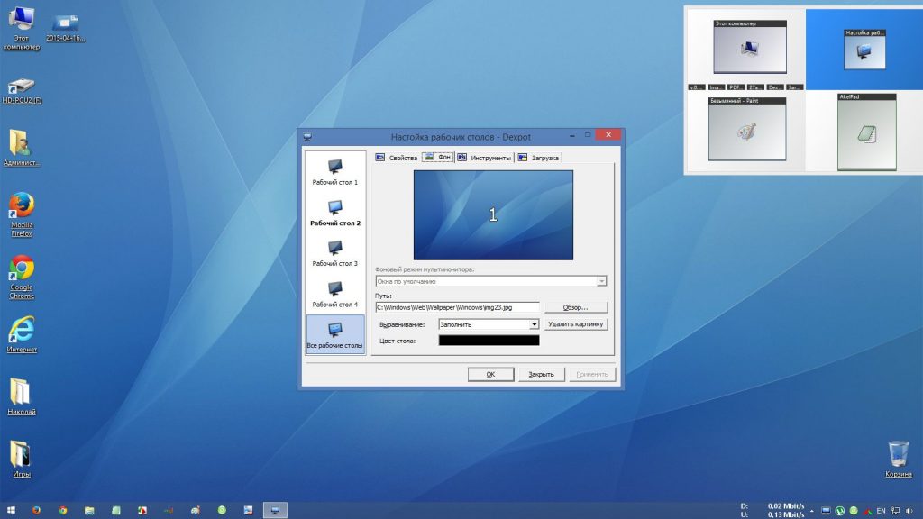 Dexpot – удобная утилита, которую используют в качестве инструмента для разрешения экрана как в Windows 10, так и более старых версиях. Кроме того, можно создавать виртуальные рабочие столы, которые не будут связаны между собой. При том их количество может достигать 20 шт. Каждый пользователь имеет возможность переключаться между ними с помощью комбинаций клавиш или специального значка в лотке. Доступ к данным, которые находятся на рабочих столах, также можно заблокировать, используя пароль. Для программного уровня можно пользоваться различными плагинами, которые дают возможность переключаться между рабочими столами. Есть и портативная версия данной утилиты, которая не нуждается в установке. И ею можно пользоваться сразу после загрузки. Есть ещё один компонент, который называется «ускорить компьютер». Но его не стоит использовать, поскольку он до конца не доработан разработчиками.