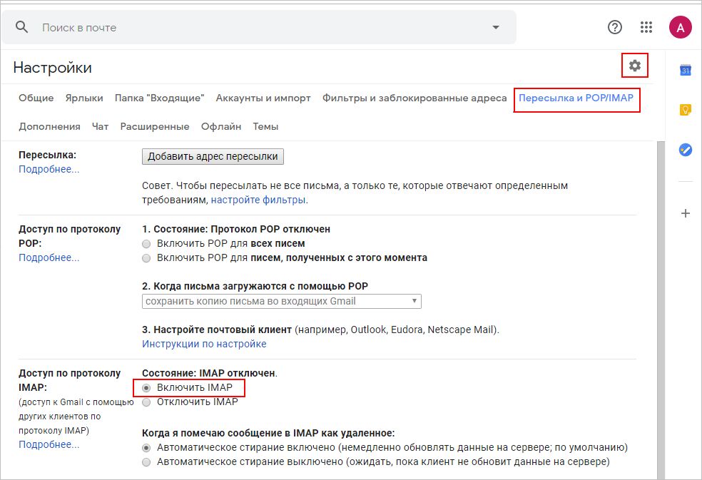 Войдите в свой аккаунт Gmail через браузер. В настройках найдите и включите IMAP. Выйдите из аккаунта.