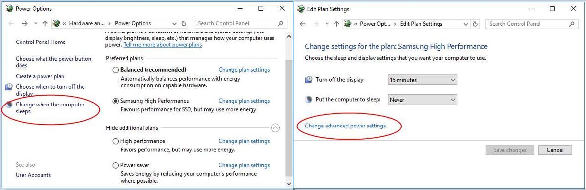 2) Нажмите Меняйте, когда компьютер спит. потом Изменить дополнительные параметры питания .