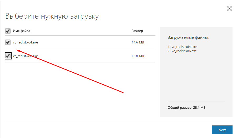 Если Вы обладатель 32 разрядной системы, то скачайте файл vc_redist.x86.exe, в противном случае, если у Вас 64-битная система, то необходимо скачать одновременно две версии:vc_redist.x86.exe и vc_redist.x64.exe.