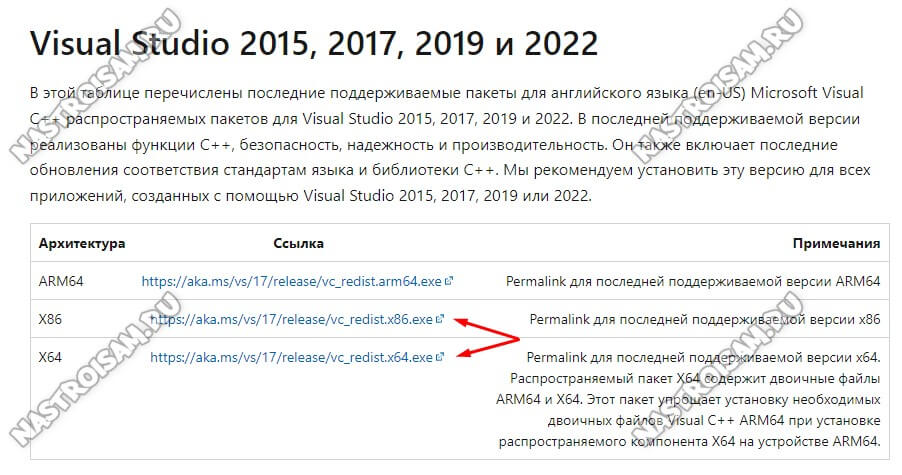 - Установка сразу x64 и x86 (32-бит) версий библиотек требуется в том числе в 64-разрядной системе, поскольку многие программы, несмотря на разрядность ОС, являются 32-битными и требуют соответствующих библиотек.