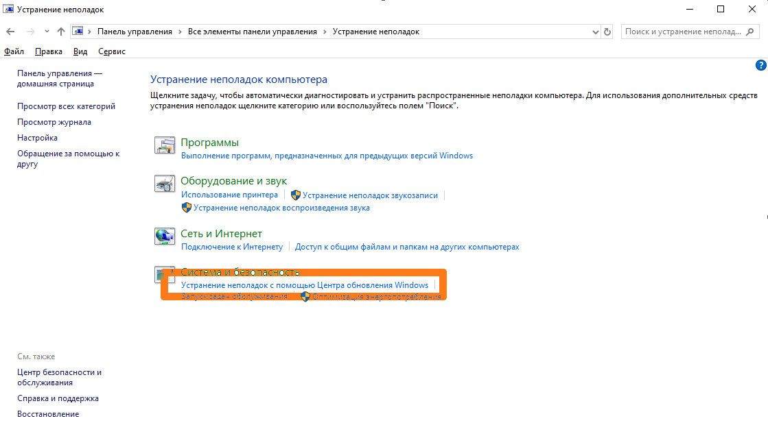 Запустить «Устранение неполадок с помощью Центра обновления Windows»