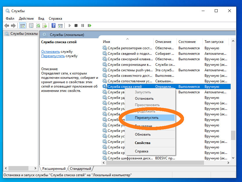 Открываем список служб Windows и ищем там службу «Служба списка сетей» (в английской версии Network List Service). После чего выделяем ее мышкой, жмем правую кнопку и выбираем пункт «Перезапустить», как на скриншоте ниже: