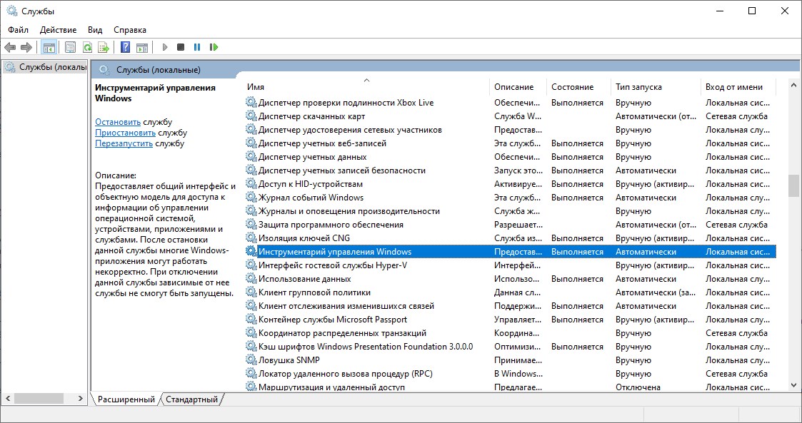В списке служб Windows необходимо найти службу «Инструментарий управления Windows», и убедится, что она включена.