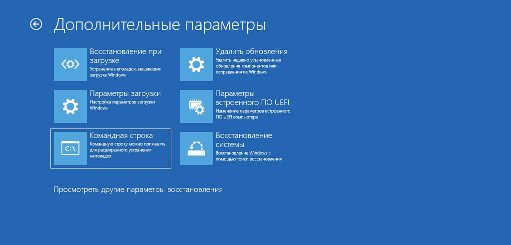 Необходимо открыть командную строку. Для этого нужно снова перейти в раздел неисправностей, а затем в дополнительные настройки.