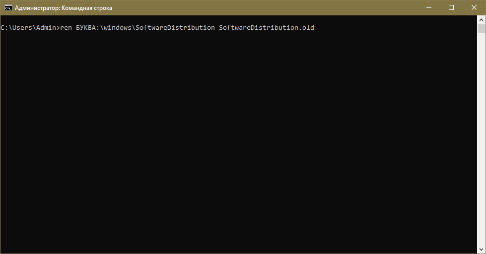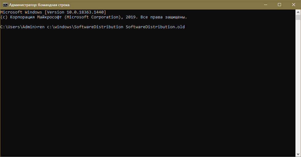 Запускаем командную строку от имени Администратора. Вводим следующее: «ren c:\windows\SoftwareDistribution SoftwareDistribution.old».