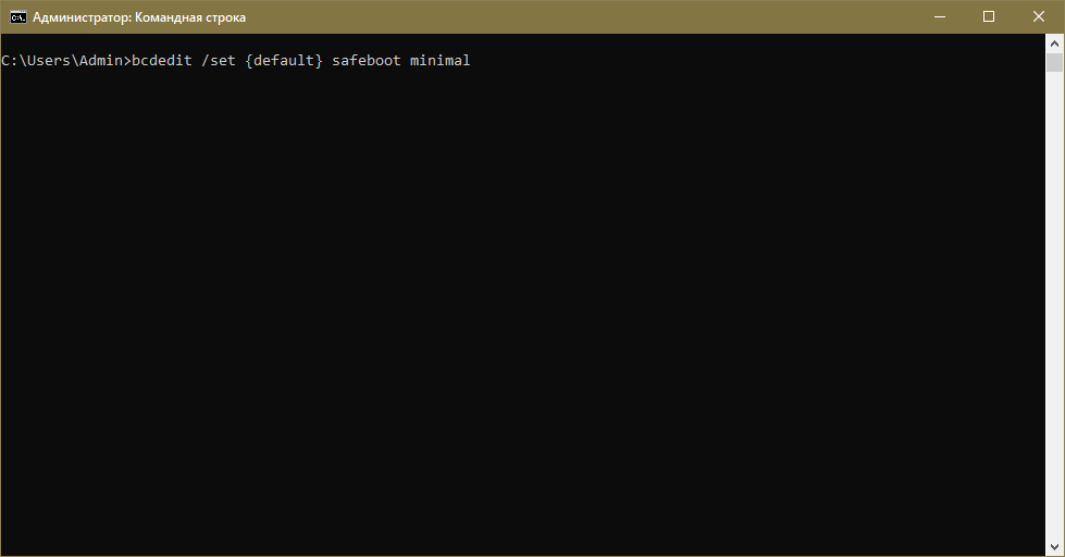 - Вводим «bcdedit /set {default} safeboot minimal».