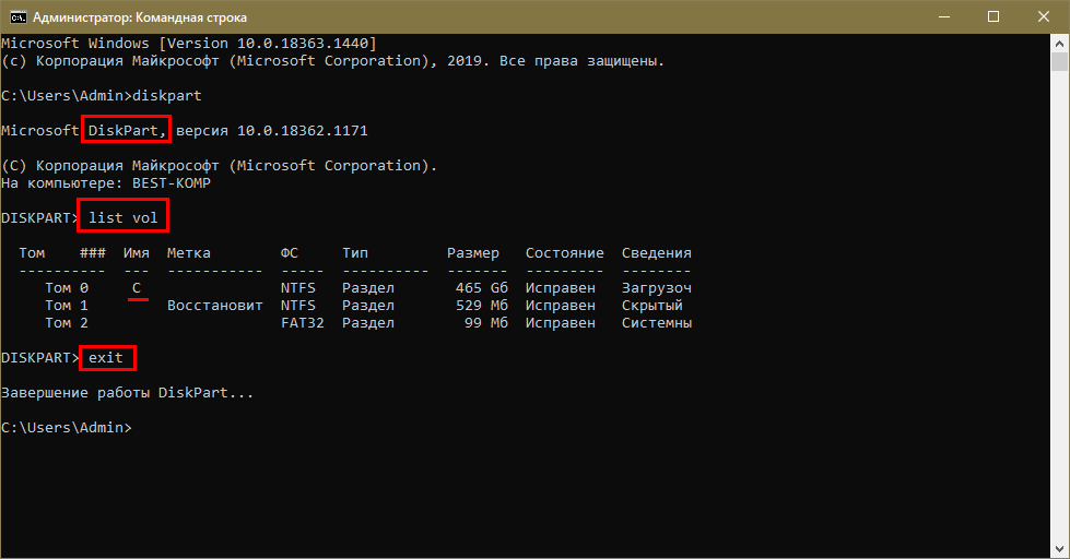 - list vol – смотрим букву диска, на котором установлена операционная система.
