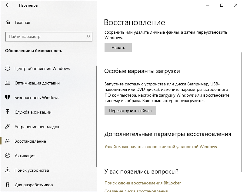 Нажимаем «Пуск», «Параметры», «Обновление и безопасность». В меню слева выбираем «Восстановление» и в особых вариантах загрузки нажимаем на кнопку «Перезагрузить сейчас».