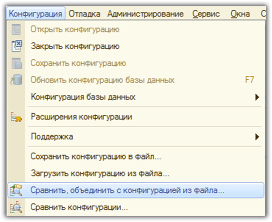 Затем снимаем неработающую конфигурацию с поддержки и делаем объединение с сохраненным файлом cf. Если требуется, объединяем с восстановлением поддержки. Не забудьте перед этим действием сделать резервную копию!