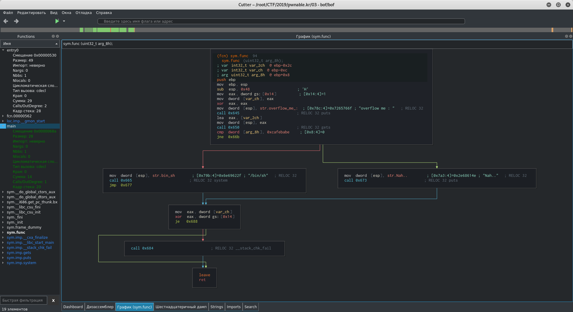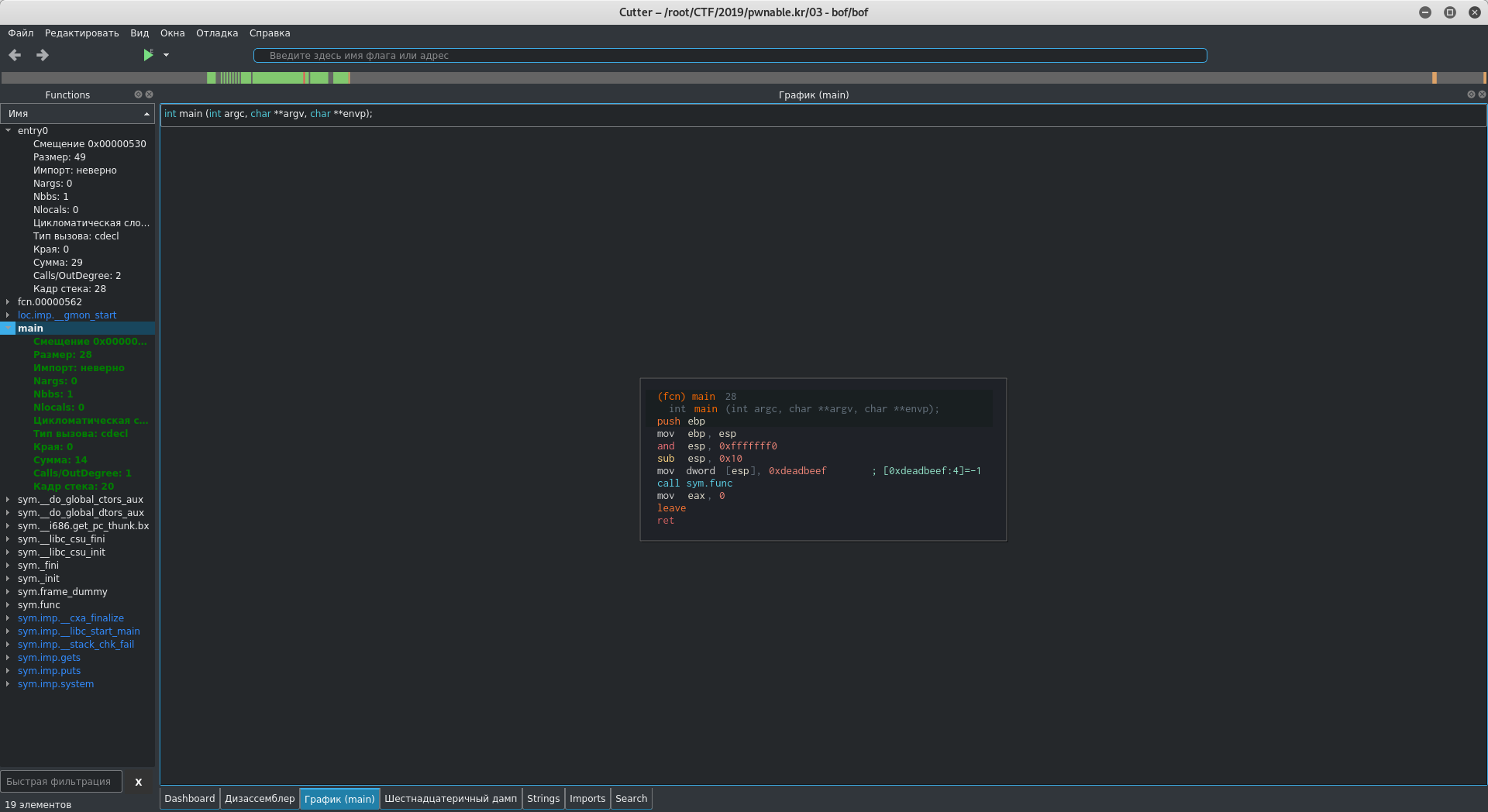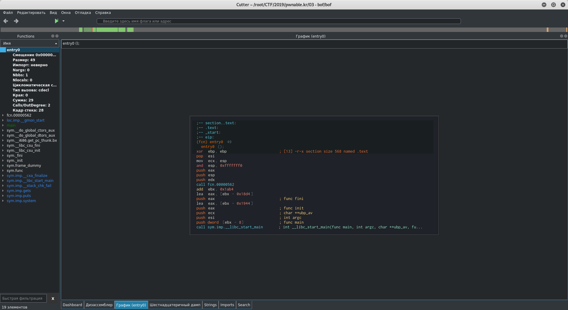 Cutter отправляет нас сразу в точку entry. В списке функций выбираем main.