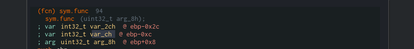 Перед кодом функции имеется комментарий, где отражаются используемые в функции переменные и их адреса относительно базы текущего кадра стека (ebp). Как можно определить, наш буфер — это переменная var_2ch, а ключ — arg_8h.