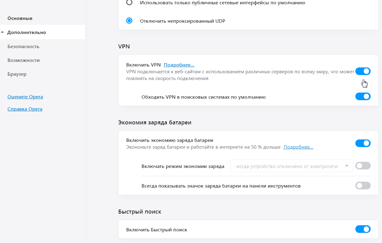 - Передвинуть соответствующий ползунок таким образом, чтобы ВПН оказался в активном состоянии.