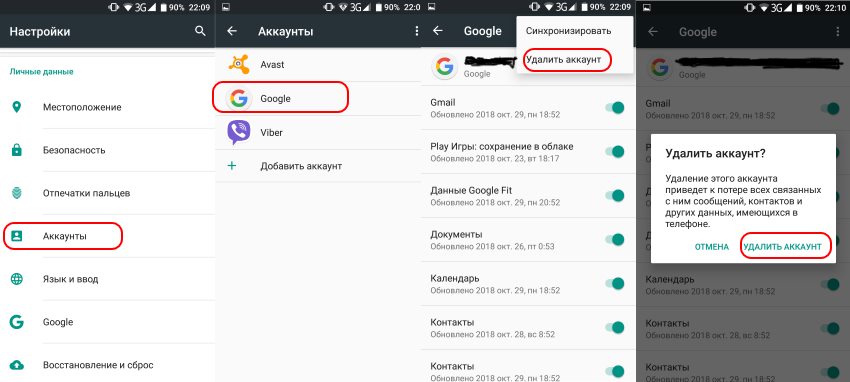 Зайдите в настройки смартфона. В группе «личные данные» найдите пункт «Аккаунты». Далее выберите «Google» – откроется список с вашим почтовым адресом в самом верху. Теперь нажмите на три вертикальные точки в правом углу сверху и там же в маленьком сплывающем окошке жмите «Удалить аккаунт