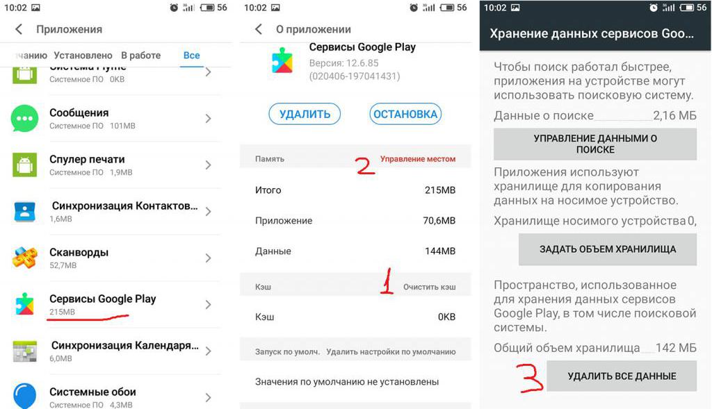 » (6-й андроид открывает список со всеми приложениями по умолчанию, в старших же версиях вам нужно сначала перейти на вкладку «Все приложения»). Нажимаем на «Сервисы Google Play» и далее на подпункт «Хранилище». Сперва жмем «Очистить кеш», а затем на «Управление местом». Тут в самом низу находим «Удалить все данные» и подтверждаем операцию. Наконец-то возвращаемся на две вкладки назад, к Сервисам Гугл Плей и жмем кнопку «Остановить».