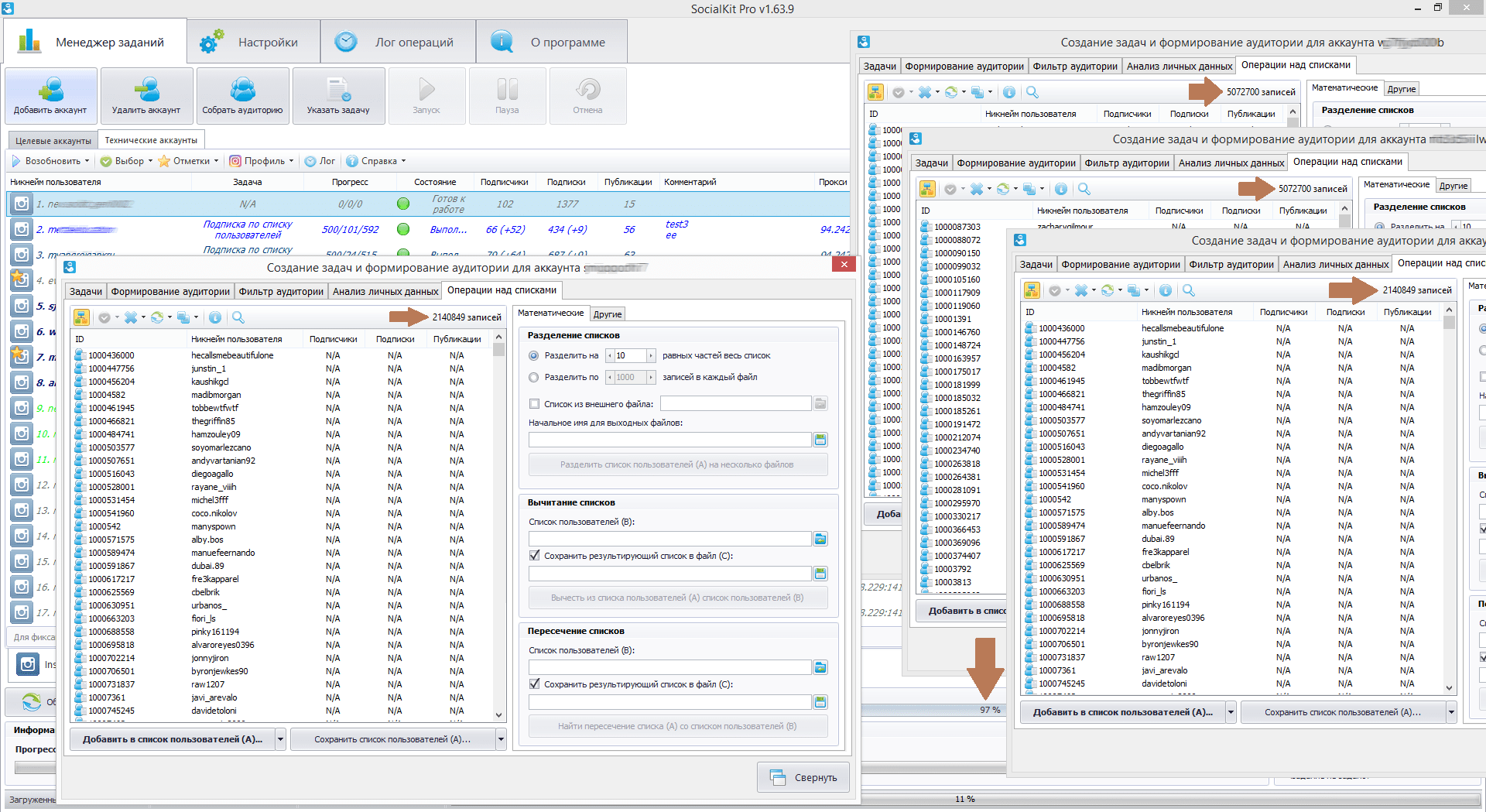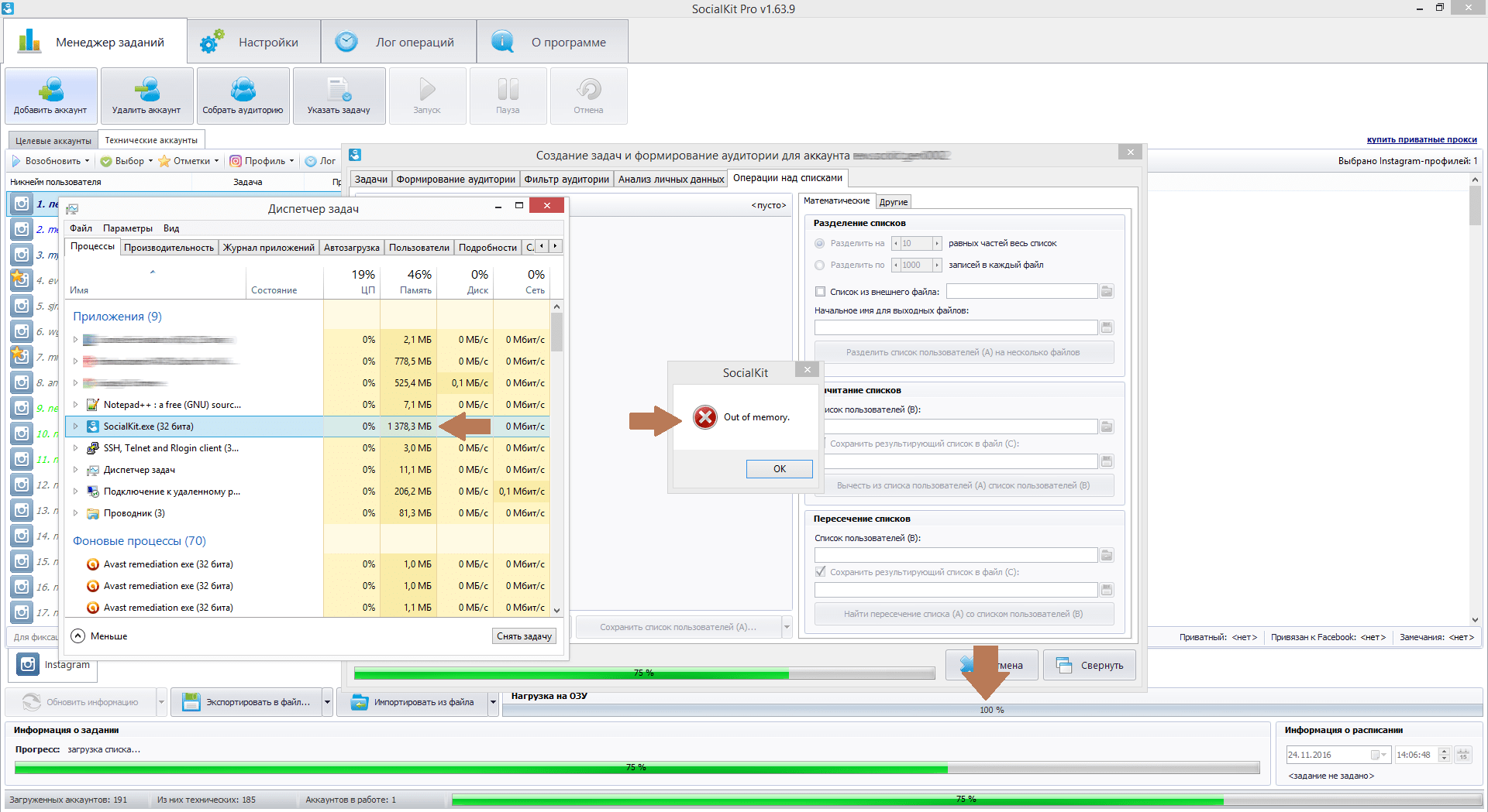 На втором скриншоте открыто сразу несколько окон с визуальными списками, в которых находится в общей сумме более 14 млн. профилей. При этом параллельно работает несколько задач и сообщения об ошибке нет, т.к. примерно 3% ОЗУ еще доступно для распределения.