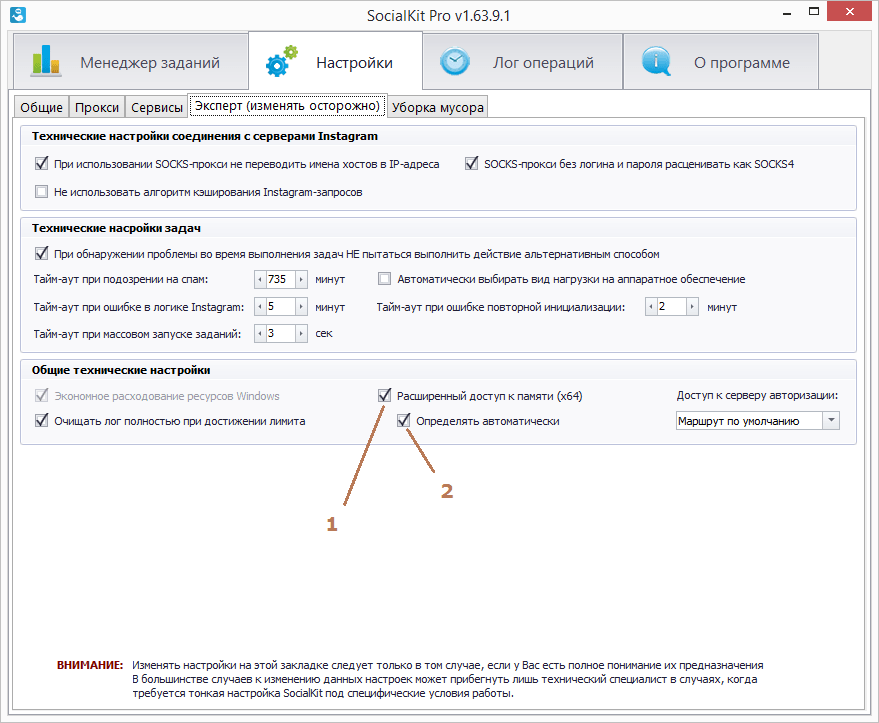 SocialKit при запуске анализирует разрядность операционной системы Windows. Если обнаруживается возможность расширенного доступа к памяти, то программа автоматически переводится в режим расширенного доступа к ОЗУ, что дает существенно большие возможности в резервировании памяти для тех или иных операций. Это позволит больше нагружать программу и реже сталкиваться с ошибкой «Out of memory».