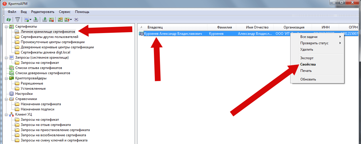 - Перейти во вкладку «Сертификаты»/«Личное хранилище»/«Свойства» выбранного сертификата.