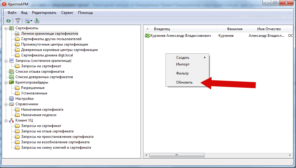 После проверки можно перейти в раздел «Личное хранилище» для обновления информации. Зеленая галочка говорит об устранении ошибки и полном доверии к электронной подписи со стороны ПО.