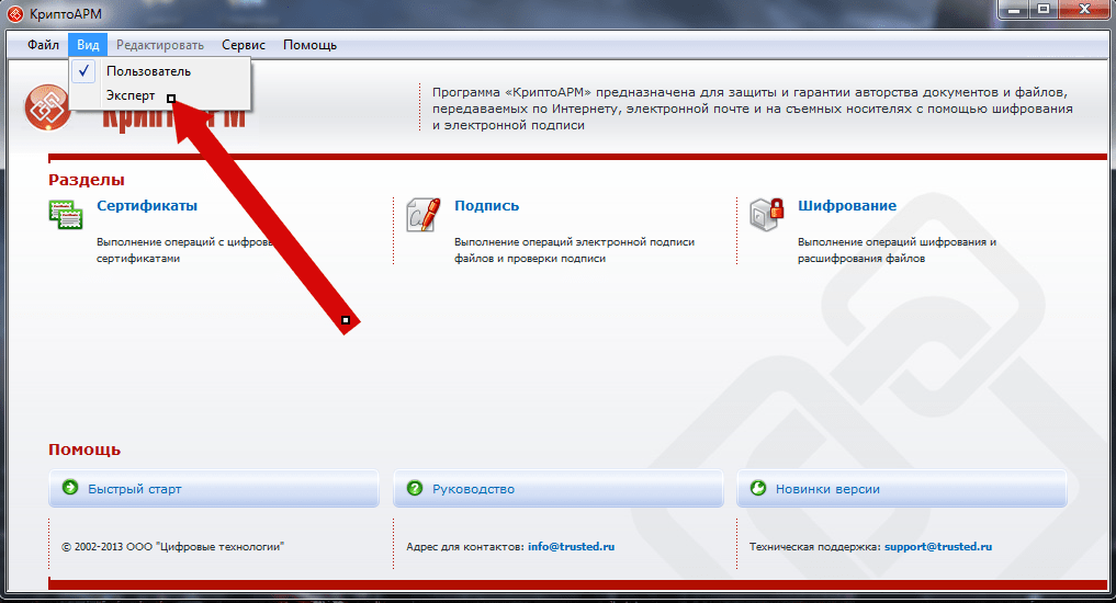 Для начала «КриптоАрм» нужно перевести в режим «Эксперт», т.к. он позволяет использовать больше функций и работает лучше.