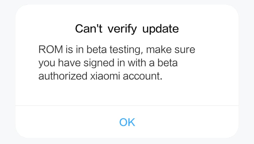 Перевод: Не могу проверить обновление. Версия находится в стадии бета-тестирования, убедитесь, что вы вошли в систему с авторизованной учётной записью бета-тестера Xiaomi.