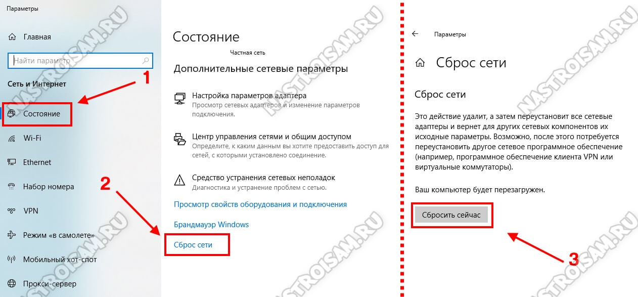 Вот за что мне нравится Windows 10, так это за то, что в ней внедрили несколько очень полезных функций. Если в той же «семёрке» надо было пробовать переустанавливать драйвера, протоколы, настройки IP и чистить кеш, то сейчас всё можно сделать разом. Для этого открываем параметры системы и заходим в раздел «Сеть и Интернет». На вкладке «Состояние» в самом низу странички есть ссылка Сброс сети.