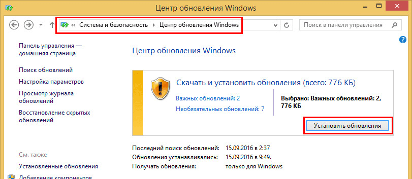 Там же осуществляется запуск поиска и установки обновлений вручную.