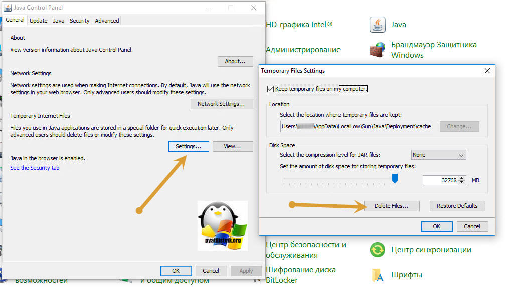 Далее как в случае с ошибкой «Failed to validate certificate. The application will not be executed» нам необходимо почистить кэш в джаве. Делается это на вкладке общие «General», через кнопку настроек «Settings». Далее нажимаем «Удалить файлы (Delete Files)»