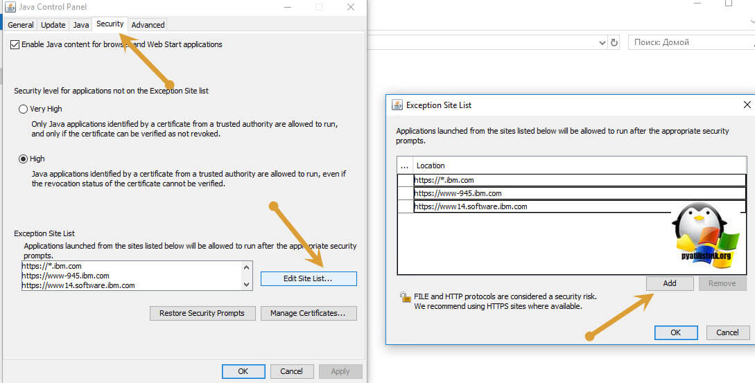Напоминаю, что подобное мы уже делали, при ошибке: Java Application Blocked. Открываем панель управления Windows, находим там значок Java. Открываем его и попадаем в Java Control Panel. Переходим на вкладку «Security». Оставьте уровень защиты на «High», чуть ниже будет пункт список сайтов для исключения «Exception Site List», по умолчанию он будет пустым. Для его редактирования нажмите кнопку «Edit Site List». Для добавления новой строки нажмите кнопку «Add» и введите нужный вам ресурс. Сохраняем настройки и перезапускаем браузер.