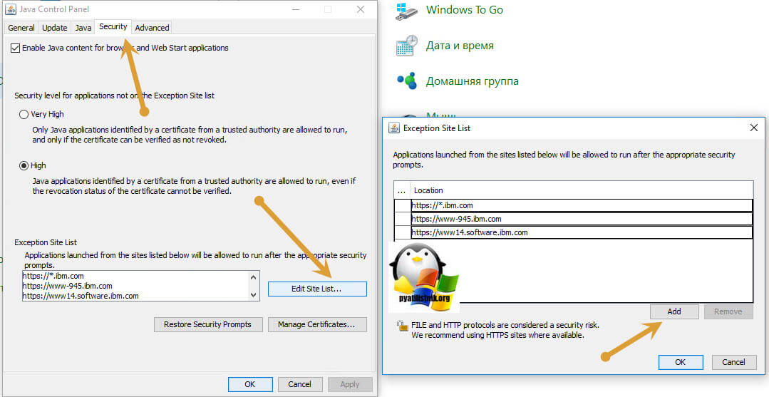 Далее перезагрузитесь после установки обновления Java. Если ошибка «unable to load resource» сохранилась, то добавьте ваш ресурс в исключения контроля безопасности, это мы так же проделывали при ошибке «Java Application Blocked». Откройте опять в панели управления Windows Java Control Panel. Перейдите на вкладку «Security» и нажмите кнопку редактирования листа исключения «Edit Site List», после чего добавьте адрес вашего ресурса через кнопку «Add». Сохраняем все и перезапускаем браузер. В подавляющем количестве случаев ошибка unable to load resource будет исправлена.