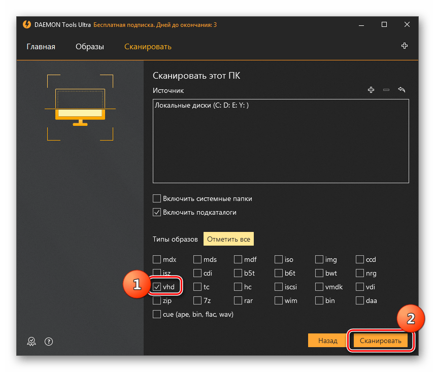 Все отметки будут сняты. Теперь поставьте галочку только около пункта «vhd» (это и есть расширение виртуального диска) и нажмите «Сканировать».