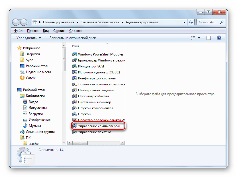 В перечне отыщите наименование оснастки «Управление компьютером» и кликните по нему.