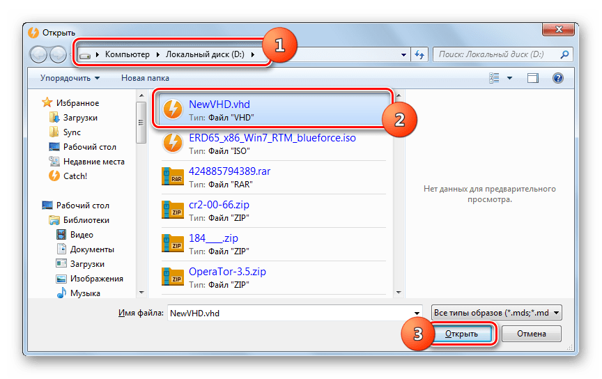 Запустится оболочка открытия файла. Переместитесь в ней в тот каталог, где находится виртуальный диск со стандартным расширением VHD, отметьте его и кликните «Открыть».